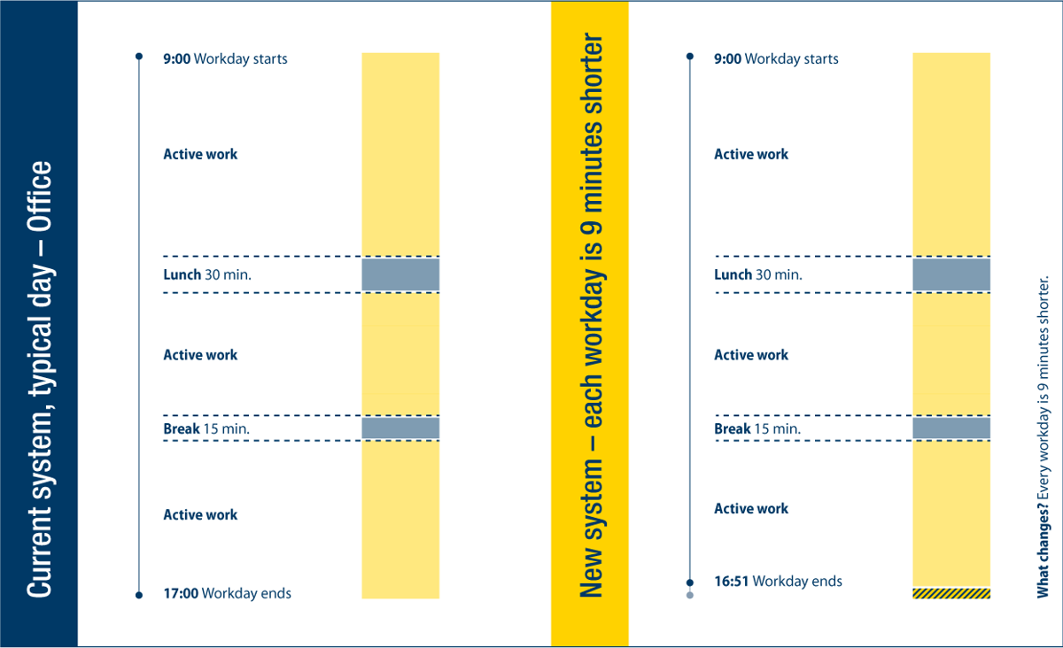 a) Each day is shortened by 9 minutes: an employee shortens the working day by 9 minutes each day and goes home earlier, on unchanged terms.