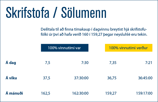 Vinnuskyldutímar á mánuði breytast því hjá skrifstofumanni úr 162 klst. 30 mínútum (162,5) á mánuði í 159 klst og 16 mínútur (159,27) á mánuði. Fyrir þá sem verið hafa með 171 klst. og 9 mínútur (171,15) vinnuskyldu á mánuði þá verður 100% vinna í 167 klst. og 56 mínútur (167,94