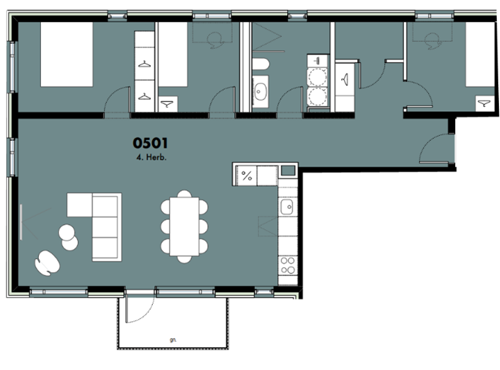 4ja herbergja íbúðirnar eru sambærilegar að skipulagi. Allar íbúðir eru endaíbúðir. Svalir/sérafnotareitir í suður, inn í garðinn. Íbúðirnar skiptast í anddyri, alrými með eldhúsi, þrjú svefnherbergi og baðherbergi. Geymslurými er innan íbúðar. Forstofuskápur er við anddyri og fataskápur í herbergjum. Innrétting fyrir þvottavél og þurrkara er á baðherbergi.