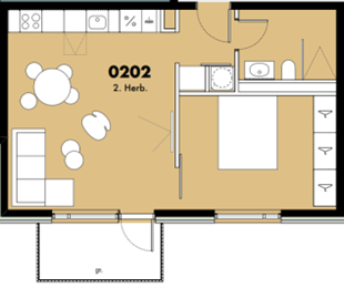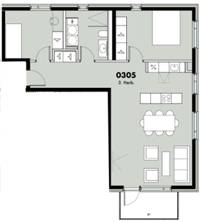 2ja herbergja íbúðirnar eru sambærilegar að skipulagi. Eitt svefnherbergi sem lokast með rennihurð, anddyri, alrými með eldhúsi og baðherbergi. Geymslurými er í sameign á hæðinni. Forstofuskápur í anddyrir og fataskápur í herbergi. Svalir/sérafnotareitur í suður, inn í garðinn. Hólf fyrir þvottavél og þurrkar er í skáp í forstofu.