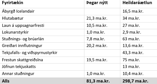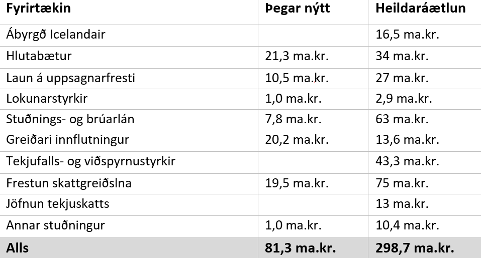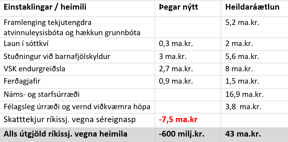 Vissulega má segja, eins og sjá má á meðfylgjandi töflu, að mörg úrræði fyrir einstaklinga eru ýmist ekki komin til framkvæmda eða hugsuð til lengri tíma, s.s. framlenging tekjutengdra atvinnuleysisbóta, ýmis námsúrræði og fjölmörg af þeim félagslegu úrræðum sem hafa verið kynnt. Þá hafa önnur úrræði án efa verið nýtt án þess að upplýsingar um það hafi verið birtar. Þetta á hins vegar einnig við um fyrirtækin. Það verður ekki framhjá því litið að skatttekjur af úttekt séreignarsparnaðar einstaklinga vega upp á móti þeim beina stuðningi sem heimilin hafa fengið í þessum faraldri.