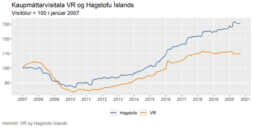 Grafið sýnir samanburð á kaupmáttarvísitölu VR og vísitölu kaupmáttar launa sem Hagstofa Íslands reiknar. Þarna má sjá að töluverðu munar á vísitölunum en vísitala Hagstofunnar sýnir að kaupmáttur launa sé 31% meiri en í janúar 2007 á meðan vísitala VR sýnir að kaupmáttur launa sé 10% meiri.