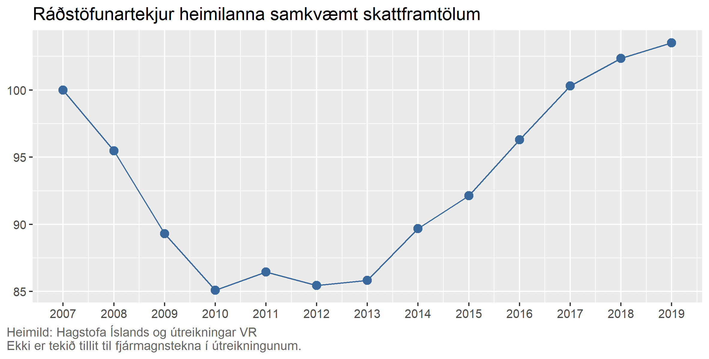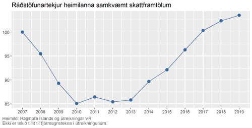 Miðað við þessar upplýsingar var kaupmáttur um 4% hærri árið 2019 samanborið við 2007. Það er því af og frá að kaupmáttur hafi verið tugprósentum hærri 2019 en hann var þegar best lét í íslensku efnahagslífi fyrir hrun 2008. Miðað við stöðuna í íslensku efnahagslífi um þessar mundir er líklegt að kaupmáttur ráðstöfunartekna muni dragast saman milli 2019 og 2020.