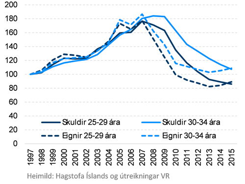 Sökum þess hve erfitt er að eignast fyrstu fasteign í dag eru eignir og skuldir ungs fólks sögulega lágar. Mynd 2 sýnir meðaltal eigna og skulda fyrir tvo aldurshópa frá 1997. Búnar eru til vísitölur fyrir aldurshópana tvo og byrja þær í 100 árið 1997. Fyrir aldurshópinn 25–29 ára var meðaleign árið 2015 lægri en árið 1997. Meðalskuldir voru einnig lægri árið 2015 samanborið við 1997.