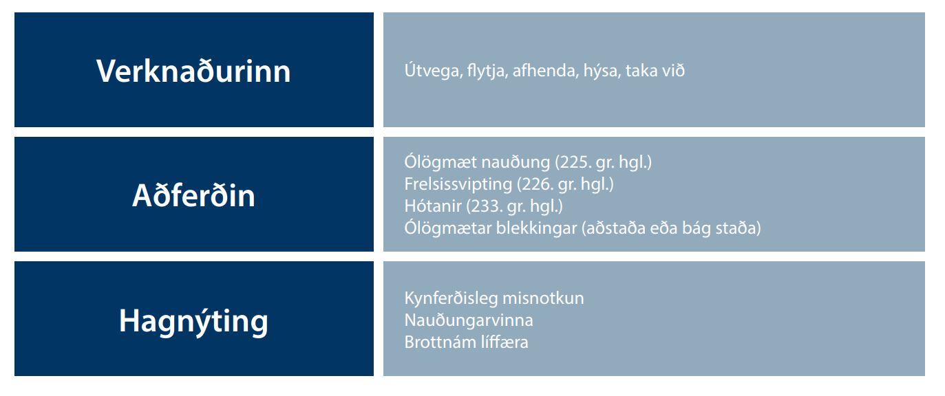 Án þess að gera nákvæmlega grein fyrir lagaákvæði 227. gr. almennra hegningarlaga sem lýtur að refsingu fyrir mansal, má til einföldunar segja að lagaákvæðið geri ráð fyrir því að til þess að um mansal sé að ræða og sakfelling náist þurfi að vera til staðar að minnsta kosti einn verknaður, ein aðferð og ein hagnýting sbr. neðangreinda mynd: